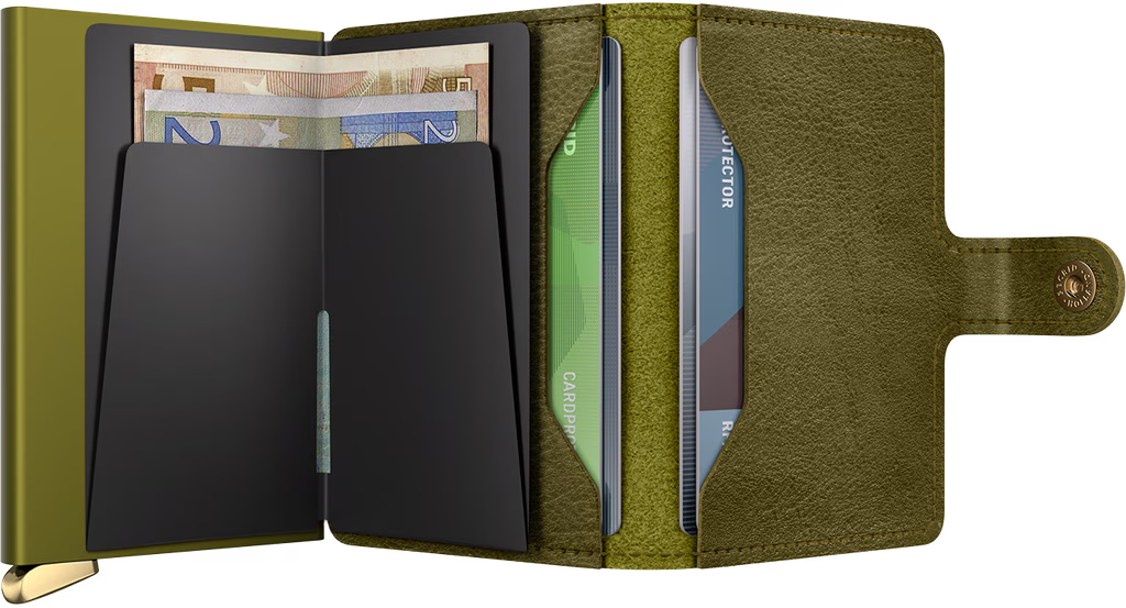 Secrid Miniwallet Premium Basco-Olive Small in size and surprisingly large in storage capacity, the Miniwallet combines the best of both worlds. The exterior holds banknotes, receipt and cards, while the aluminium Cardprotector allows you to slide out cards with one simple motion and protects them from bending, breaking and unwanted wireless communication