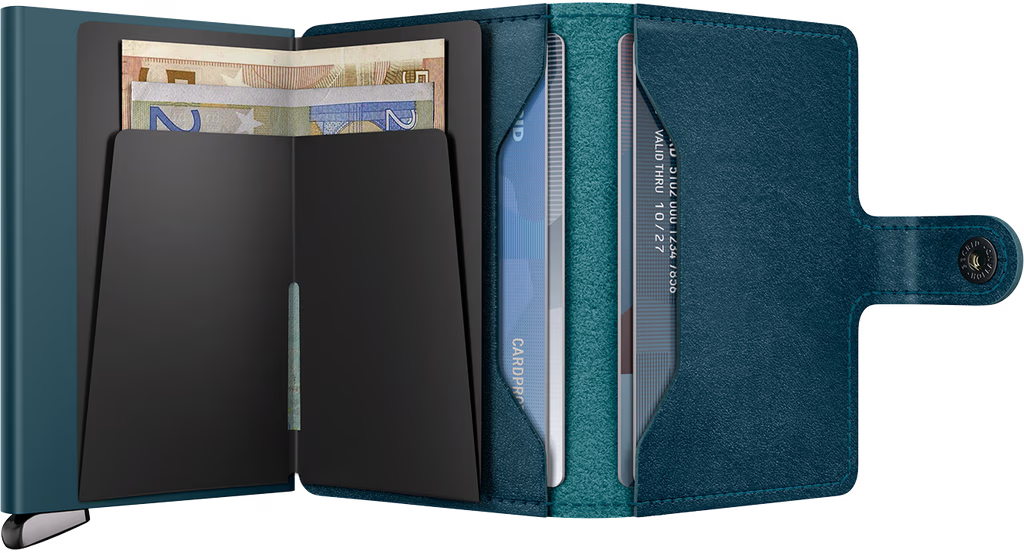 Secrid Miniwallet Premium Basco-Teal Small in size and surprisingly large in storage capacity, the Miniwallet combines the best of both worlds. The exterior holds banknotes, receipt and cards, while the aluminium Cardprotector allows you to slide out cards with one simple motion and protects them from bending, breaking and unwanted wireless communication